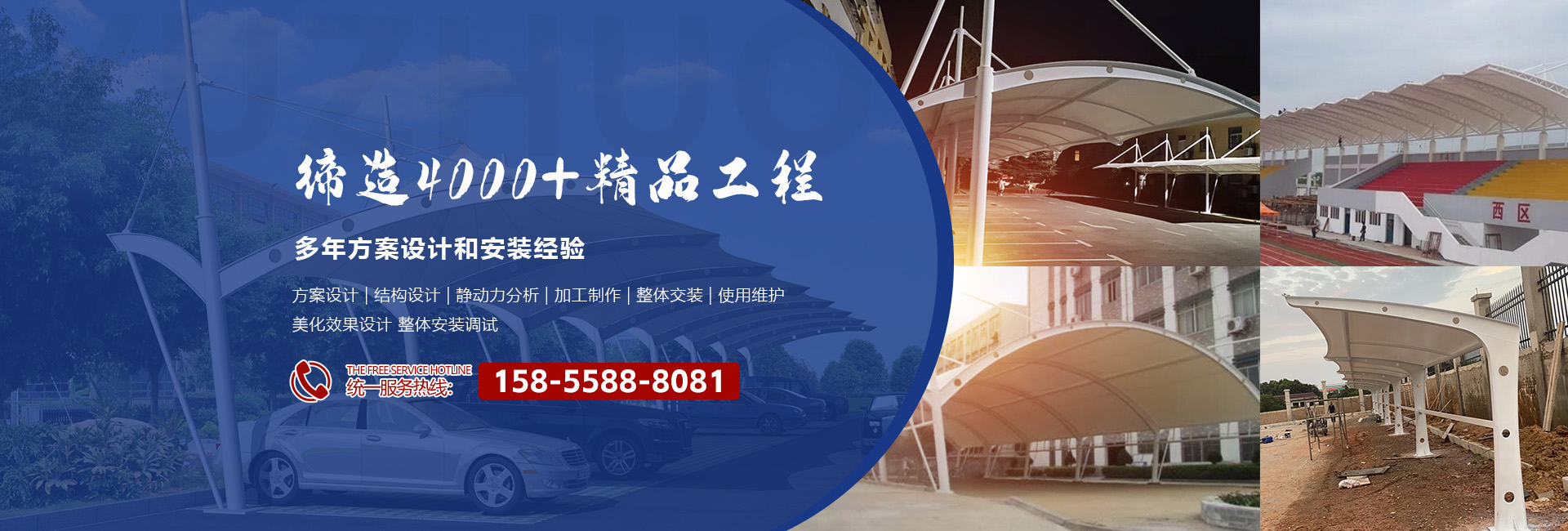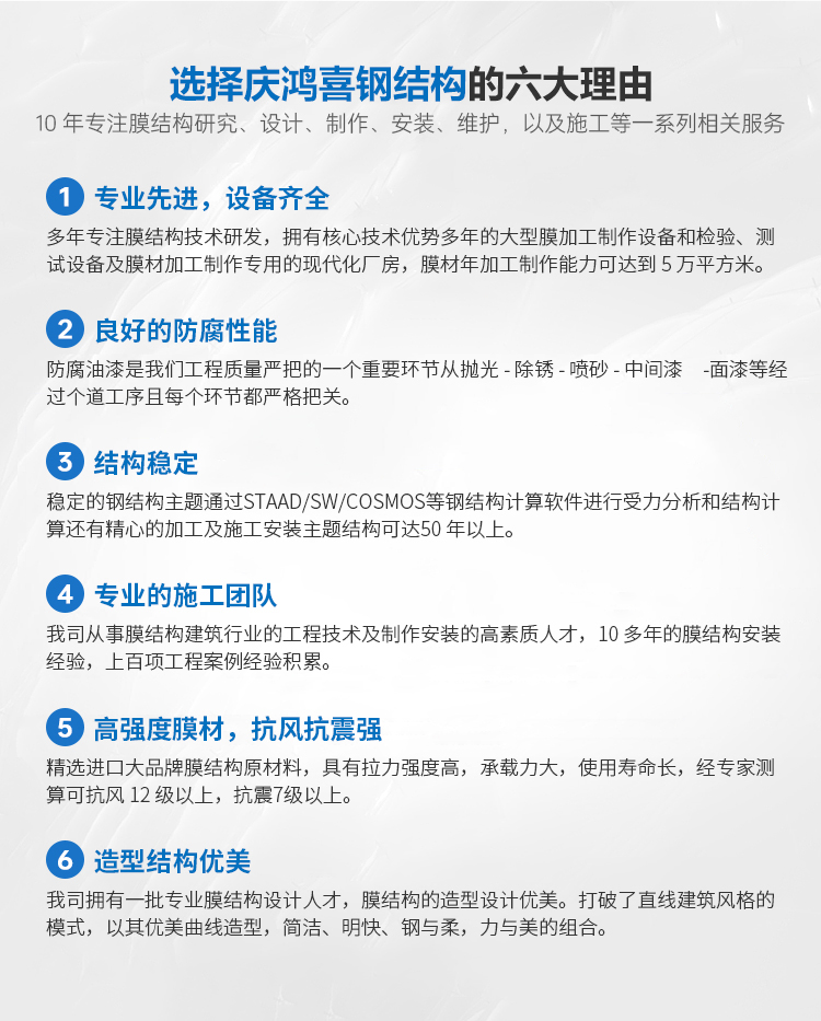 ????????安徽省慶鴻喜鋼結構有限公司是一家專業從事膜結構工程的綜合性公司。公司秉承“信譽第一、質量第一”的宗旨。開拓、發展、創新的理念。目前公司主營膜結構設計、膜裁剪設計、膜材加工及鋼結構安裝與維修。公司擁有一批國內較早從事膜結構行業的高素質技術人員和安裝隊伍,擁有先進的鋼膜設計軟件3D3S、forten32、和FSCAD,在設計上大膽創新,在加工上精益求精,在施工上安全認證,在售后上讓客戶使用放心。